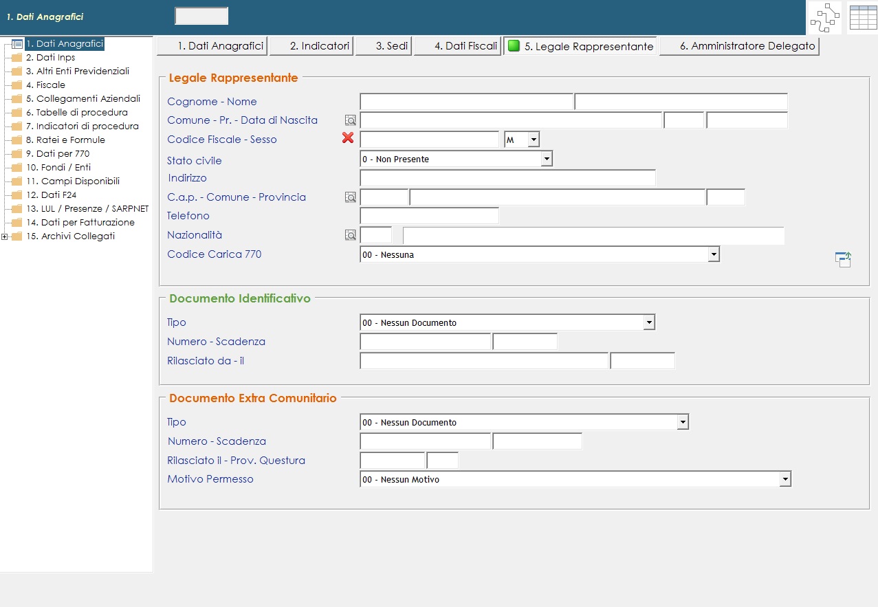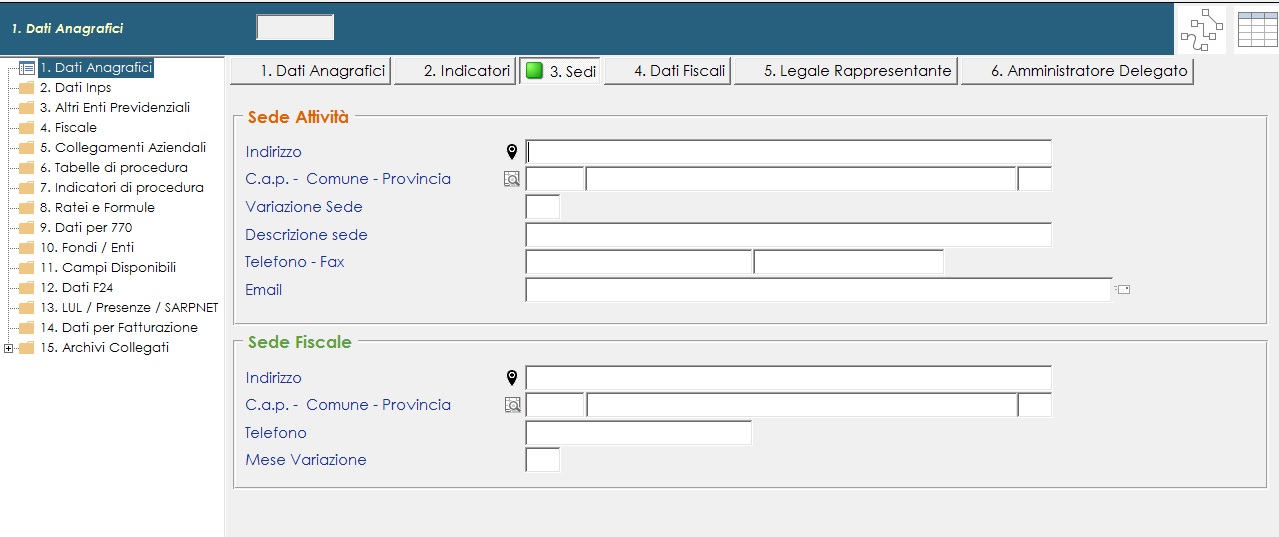 L'anagrafica ditta è composta da 13 maschere di cui le prime dieci riguardano i dati anagrafici, il domicilio fiscale e la sede di attività, il legale rappresentante e l’inquadramento dell’azienda.