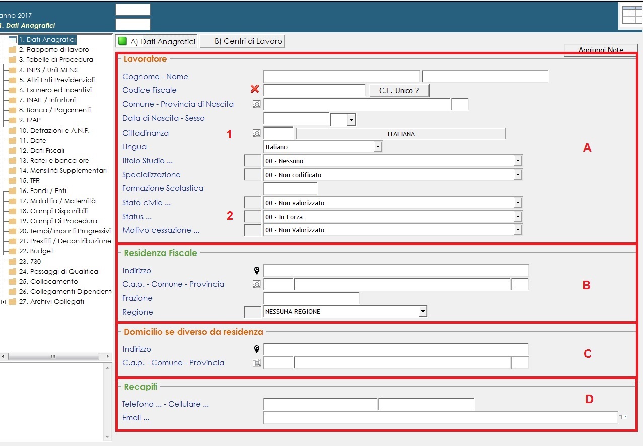 • Nella seconda sezione (B) sono presenti i dati relativi alla residenza del dipendente.