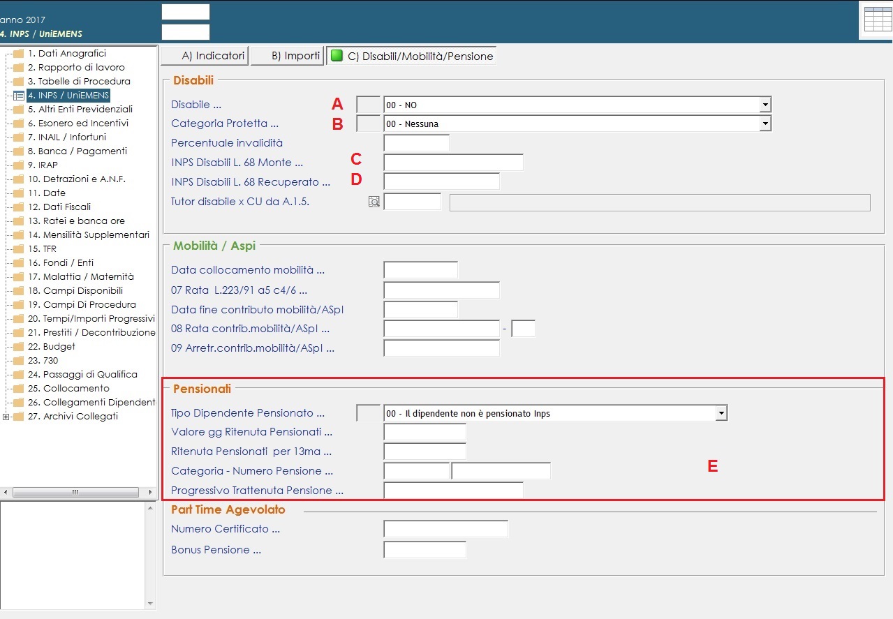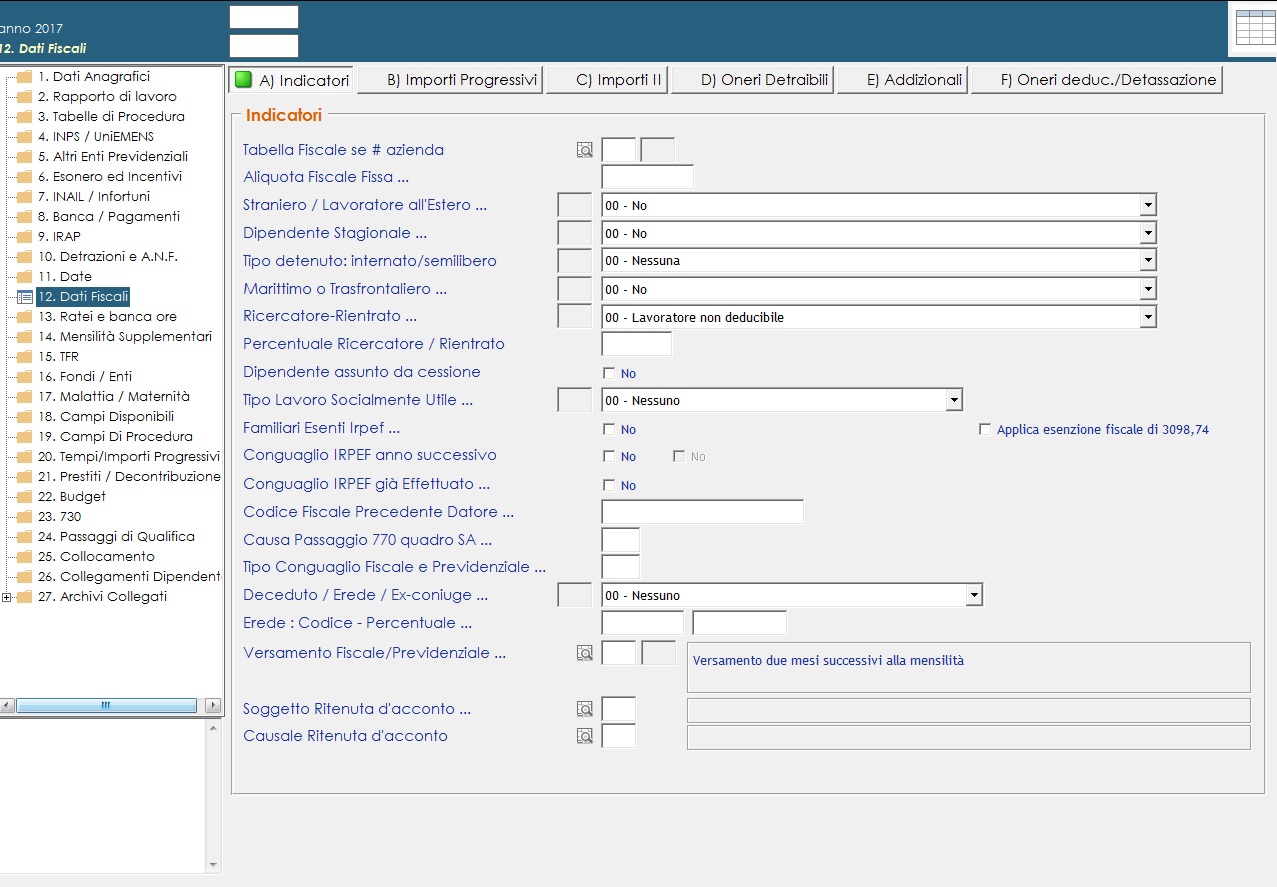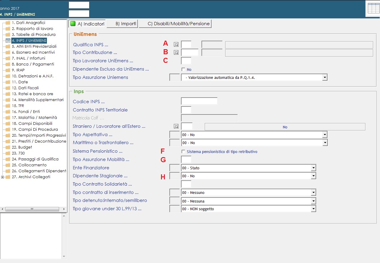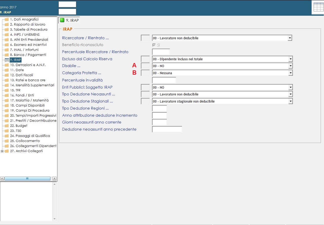 • A e B : Indicatore da valorizzare per i dipendenti disabili utile anche per avere il dettaglio nelle stampe di fine anno (vedi ad esempio Irap, quota di riserva, ecc.).