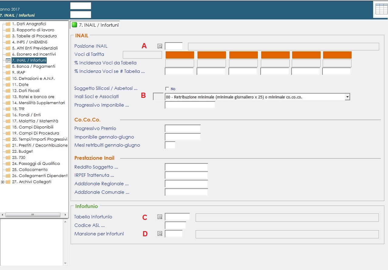 • D: codice mansione per l'invio telematico della denuncia infortuni all'Inail (deve essere presente in A.4.B.).