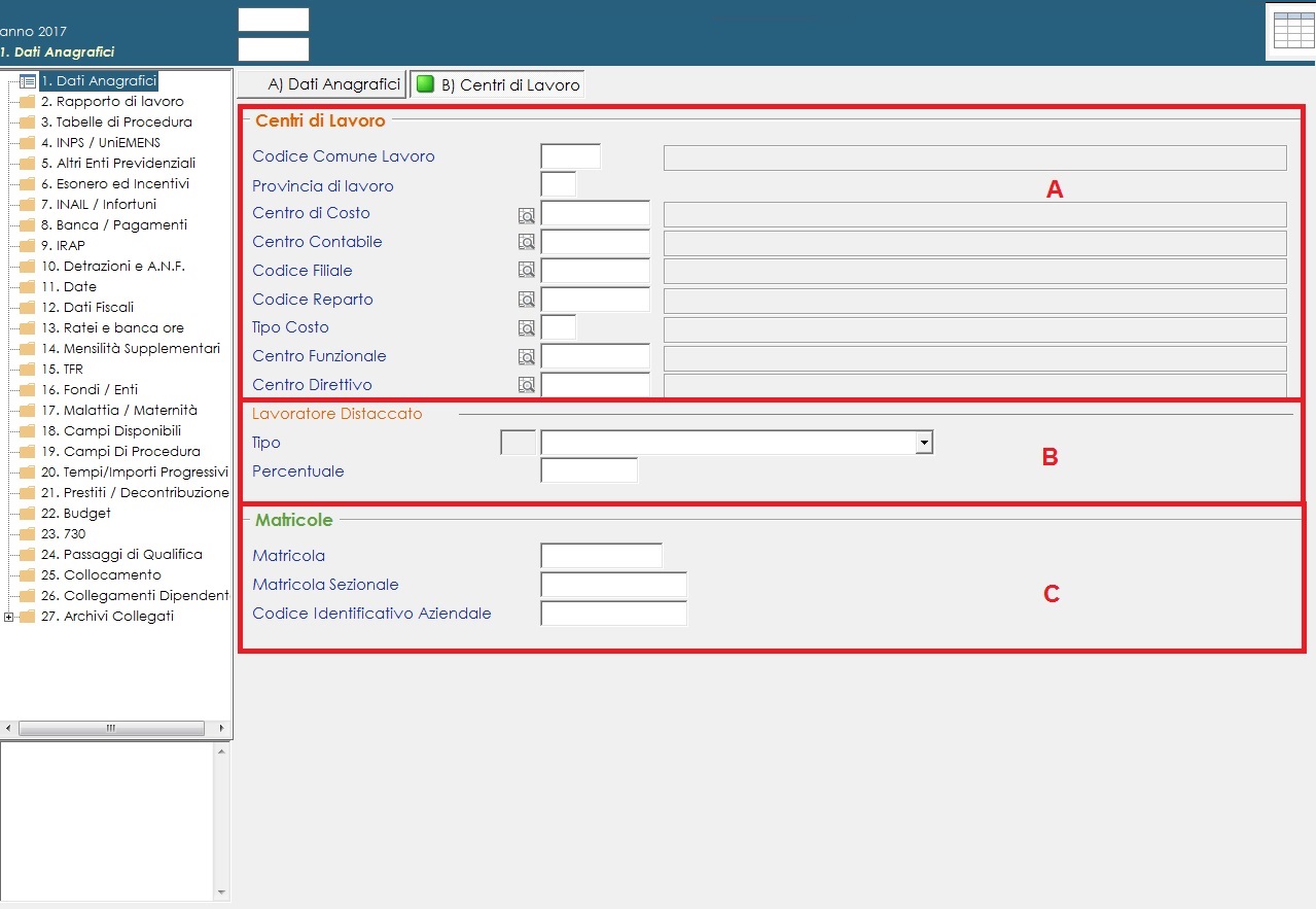 • Nella prima sezione (A) è possibile indicare le varie scomposizioni (centri di lavoro) del dipendente.