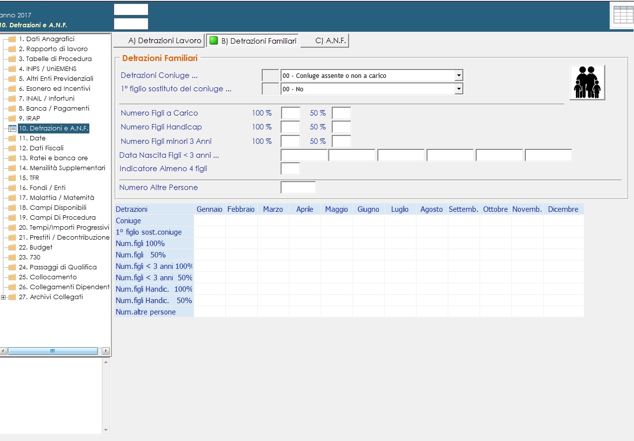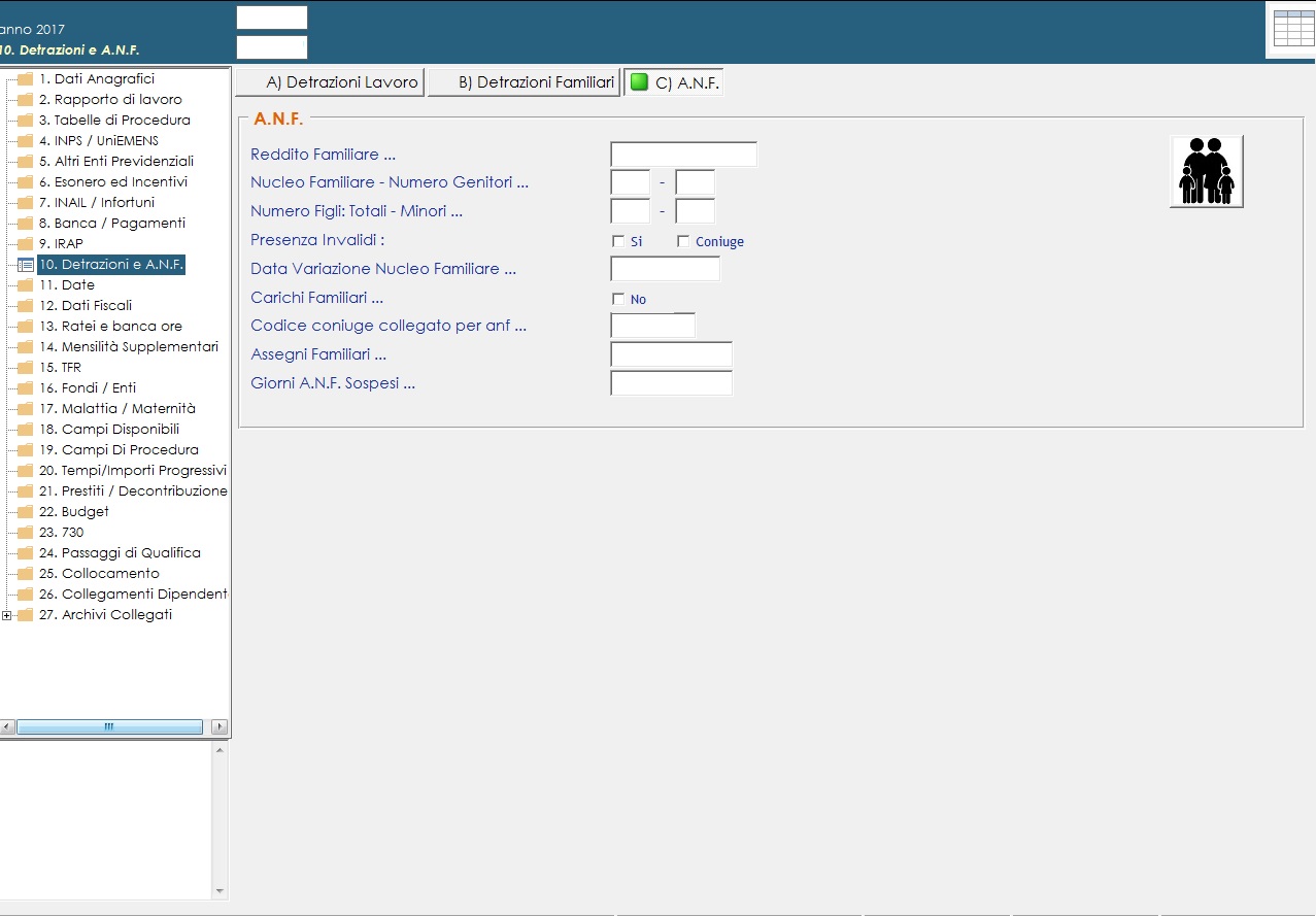 In questa maschera vengono riportati gli indicatori relativi alle detrazioni familiari e agli assegni nucleo familiare (ANF), secondo i dati caricati in P.1.E (archivio aggiornabile oltre che dal menù, anche cliccando sull'apposita icona della famiglia, direttamente da questa videata).