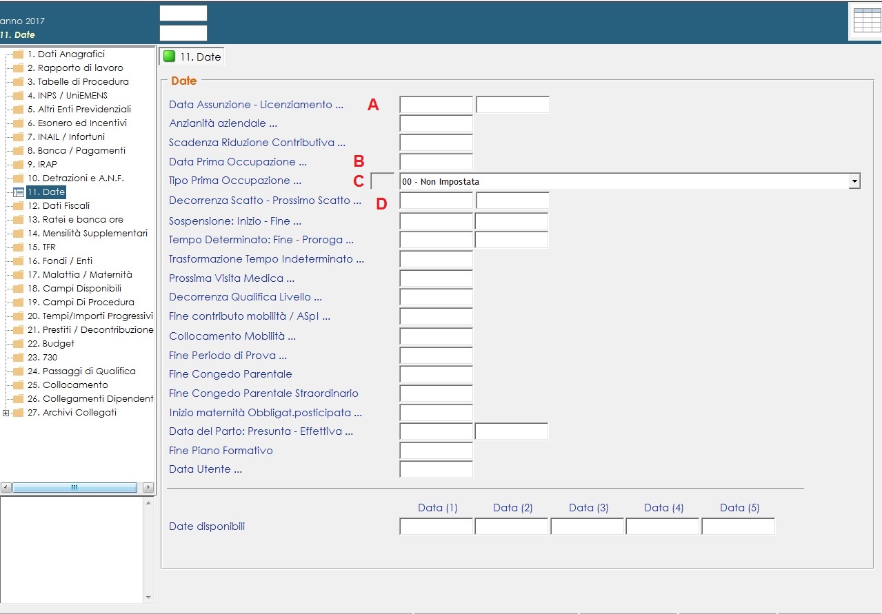 • D: date utili per il calcolo degli scatti di anzianità, aggiornate in automatico dal programma di inizio mese P.5.H.