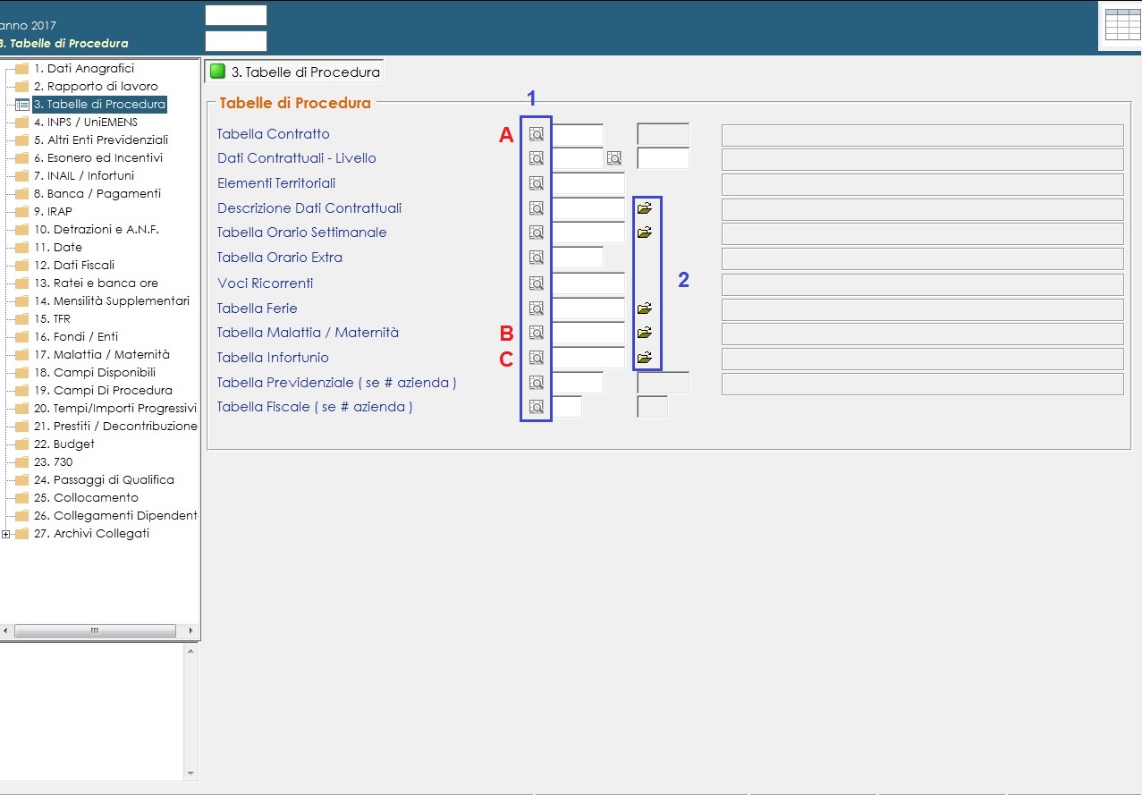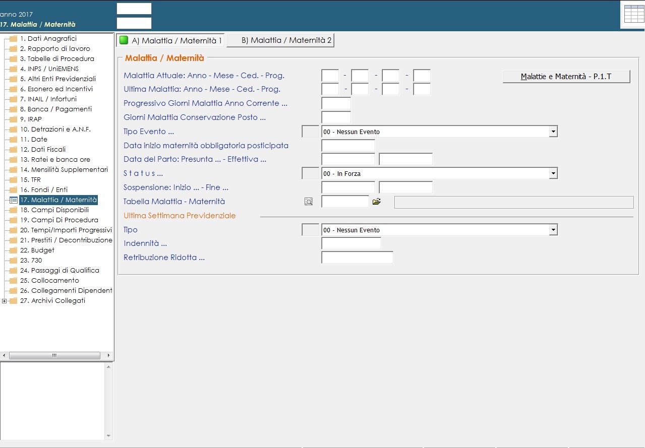 • B: tabella da caricare in base al contratto per il calcolo del trattamento economico degli eventi di malattia e maternità (deve essere presente in P.2.E.).