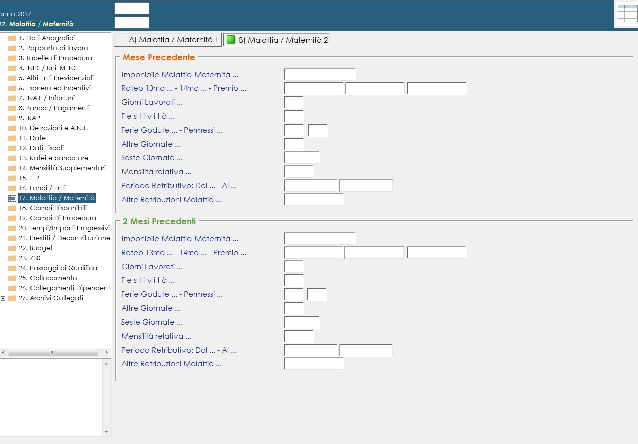 In questa maschera sono presenti i dati del mese precedente (retribuzione, ratei e giorni) per il calcolo della retribuzione media giornaliera Inps in caso di malattia e maternità.