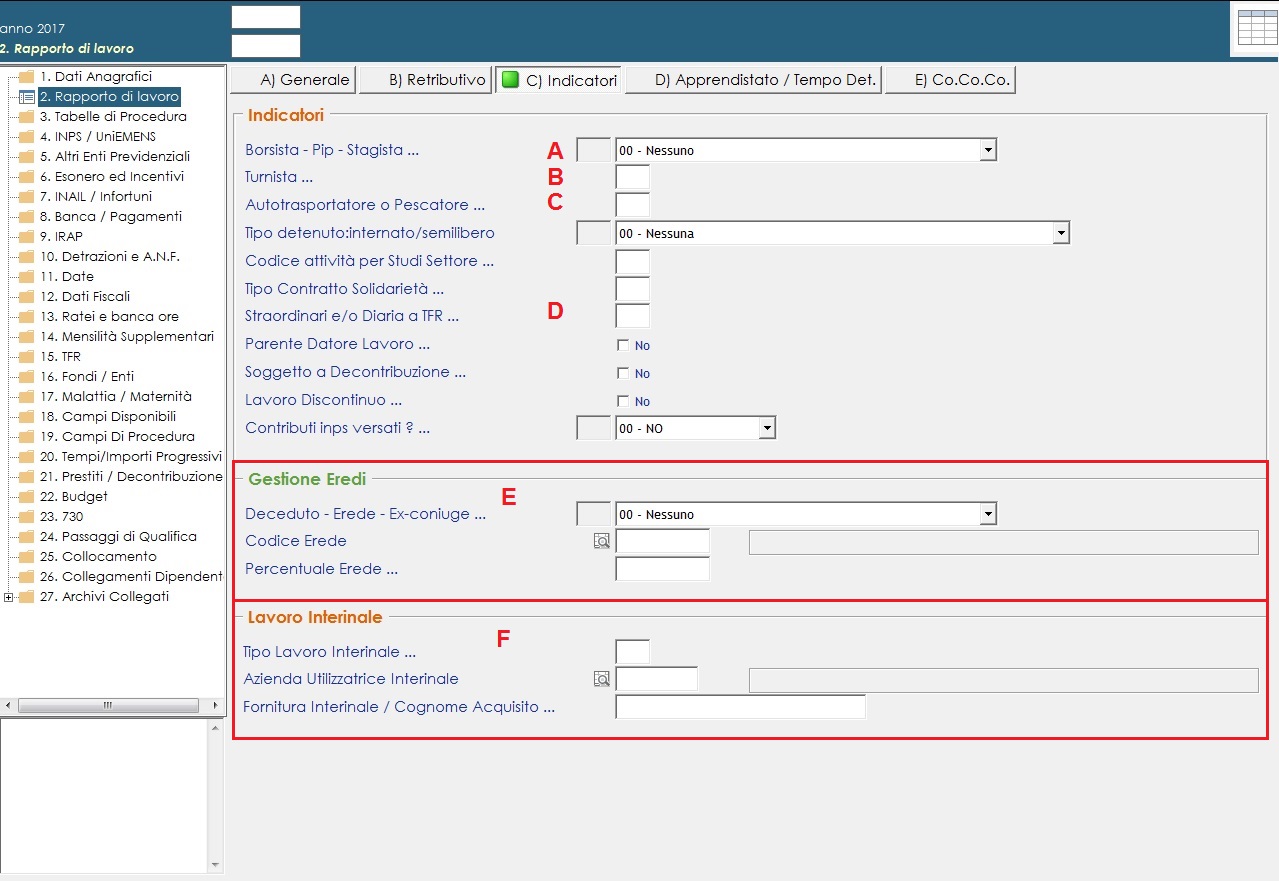 Nella sezione "2 - Rapporto di lavoro" -> "C - Indicatori" si trovano i campi per la gestione del lavoratore deceduto (de cuius) e dei suoi eredi.