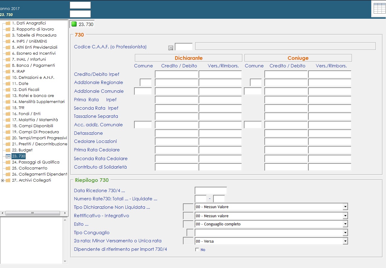 Va inserito il codice caaf che deve essere preventivamente generato nell'archivio A.4.6. Se non e' presente, ma sono presenti degli importi nella sezione 730, si intende che l'assistenza fiscale viene prestata direttamente dall'azienda.