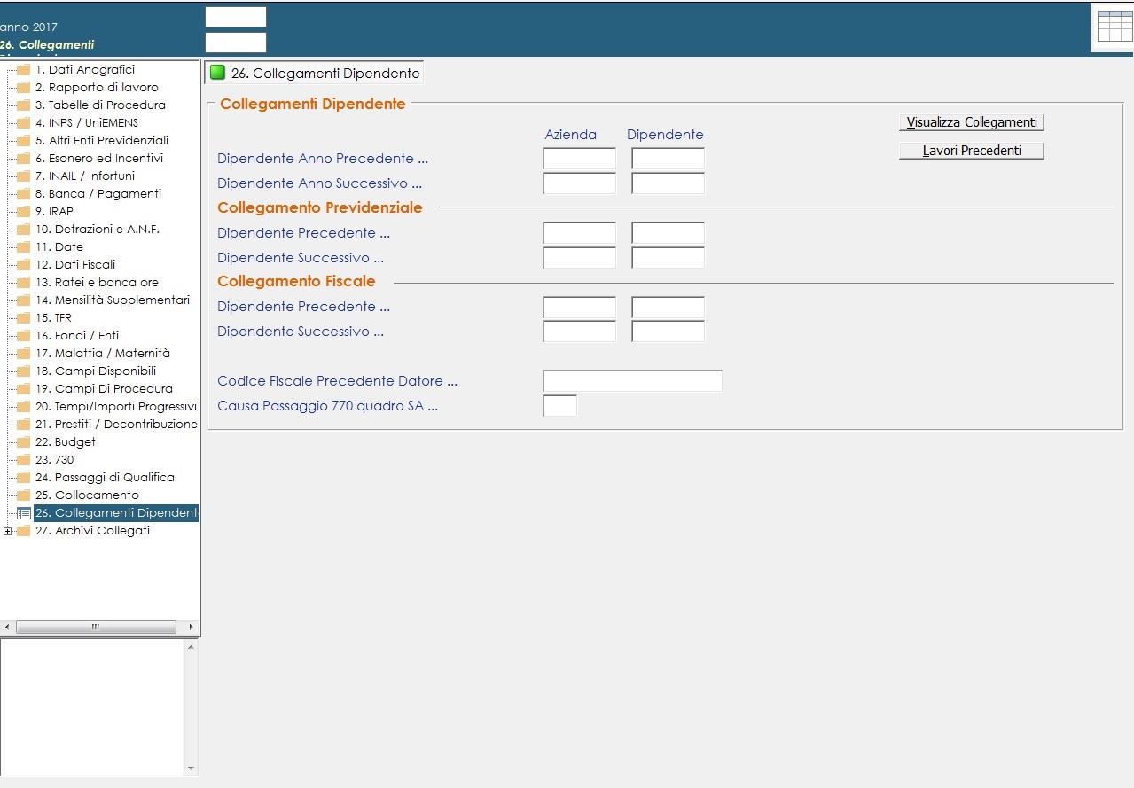 Attivando il tasto "Lavori precedenti" presente nella sezione "26. Collegamenti Dipendente" è possibile gestire riassunzioni dello stesso dipendente o inserire i dati di un precedente rapporto di lavoro, al fine di effettuare un conguaglio fiscale e/o previdenziale unico a fine anno o in caso di licenziamento.
