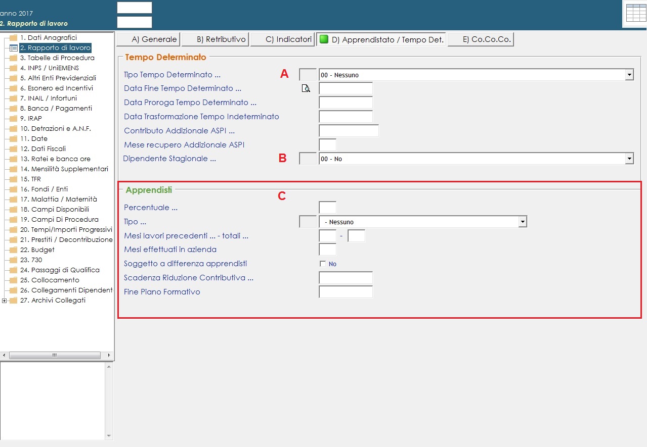• C: indicatori obbligatori per la contribuzione degli apprendisti (percentuale e tipo di apprendistato, mesi di apprendistato già effettuati nei lavori precedenti e mesi totali di apprendistato previsti nel contratto di assunzione).