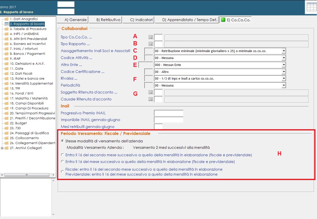 I Campi da A a H riguardano la gestione dei collaboratori a progetto e degli associati in partecipazione, nello specifico: