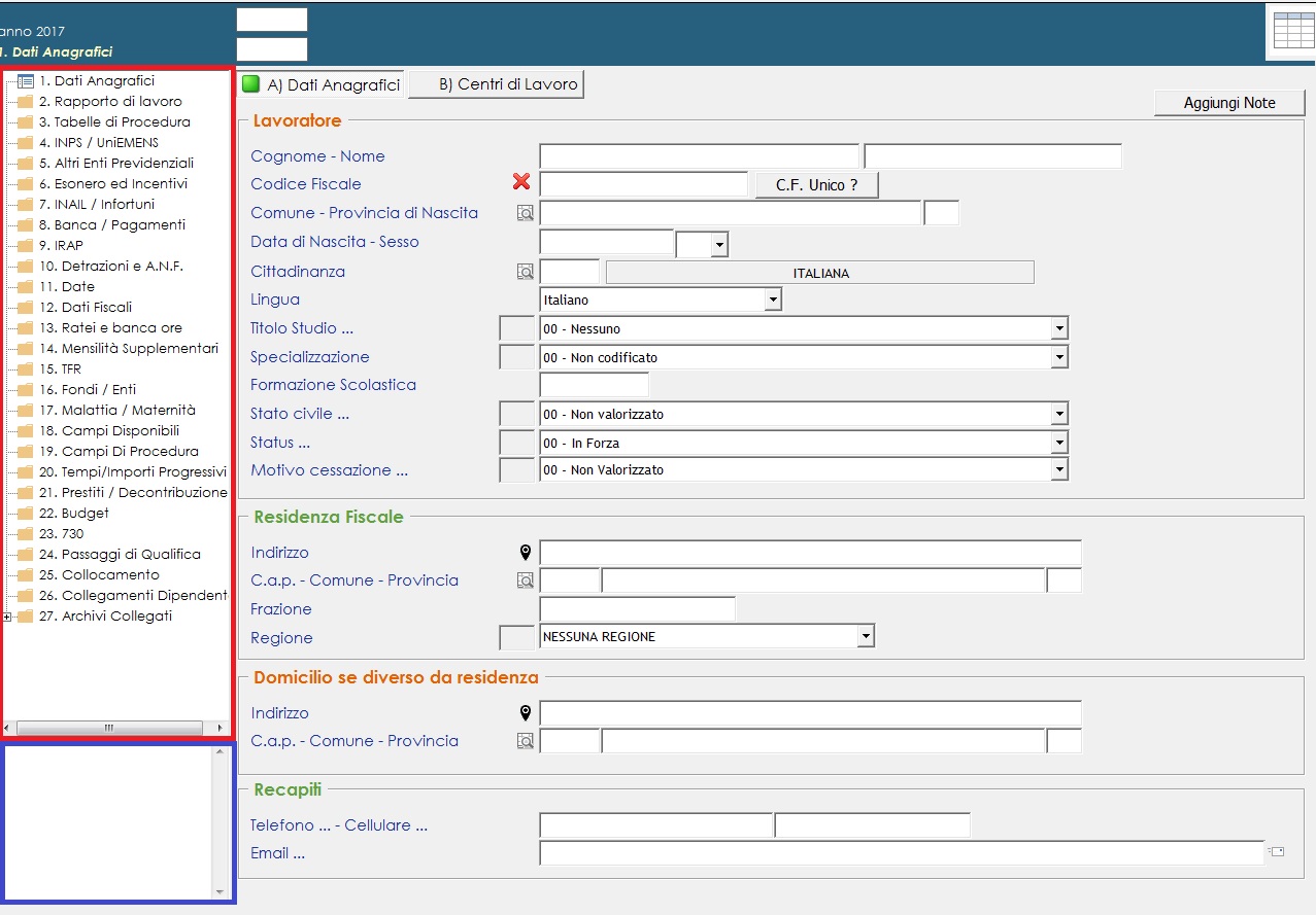 L'anagrafica del dipendente presenta una struttura della schermata sviluppata con un albero tematico (riquadro rosso) per suddividere i campi in maniera logica e non più sequenziale.