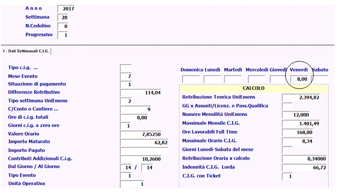Nella parte di sinstra vengono corrette le differenze da accreditare per Cig ed eventualmente l'indicazione della copertura settimanale totale (X se intera settimana in Cig) o parzialmente coperta (2 se settimana parzialmente in Cig).